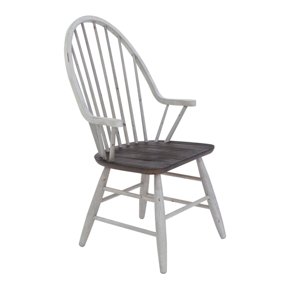Live life beautifully with the Farmhouse dining group. Crafted of rubberwood solids and veneers, this set features a two-tone whitestone finish with heavy distressing and weathered oak tops and consists of the trestle table, two Windsor back armchairs, and four Windsor back side chairs. The trestle table features a solid wood top with two removable 18” leaves with refectory ends. The Windsor chairs, known for their comfort, feature nylon chair glides to protect your flooring and has the same two-tone finish as the table.