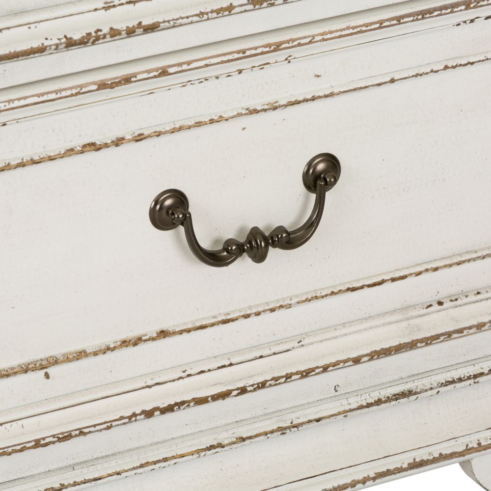 Accent your bedroom with the perfect blend of European Traditional design, using the Magnolia Manor youth bedroom set. Crafted of poplar solids and birch veneers, this kit features an antique white finish with heavy artistic chipping. The bed features tufted chenille upholstery, laced with tone’s of white, tan and brown threading, bead molding, bolt on rails, and a center support slat system, ensuring reliability and longevity. The arched crowning and dog bone accents on each corner effortlessly add both definition and character, completing your look. The dresser offers full extension drawer glides for easy access to storage, bottom case dust proofing to protect contents, fully stained interior drawers, cedar lined bottom drawers, antique brass knob and bail hardware, and is anchored by bracket feet. The beveled mirror features arched crown molding, bead molding, and bolt on supports to attached to the dresser. Warm antique finishes and artistic distressing along with grand scale a group to be passed to generations.