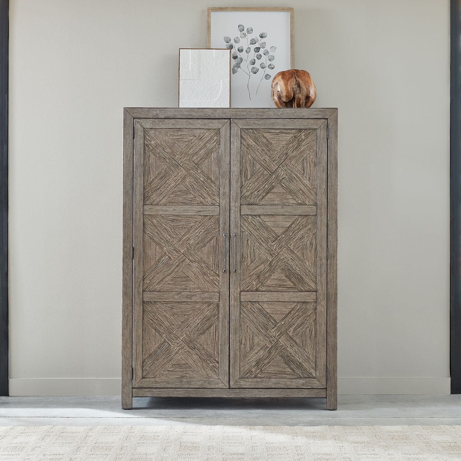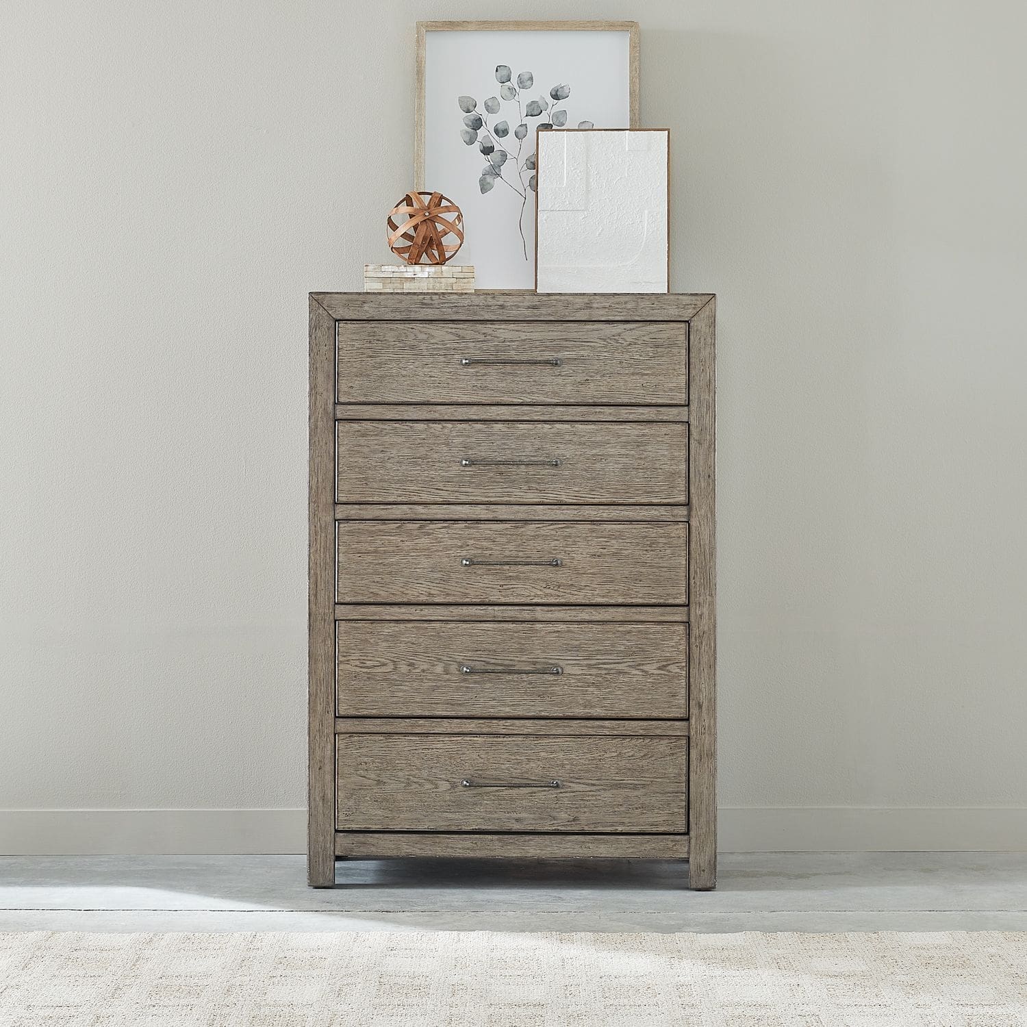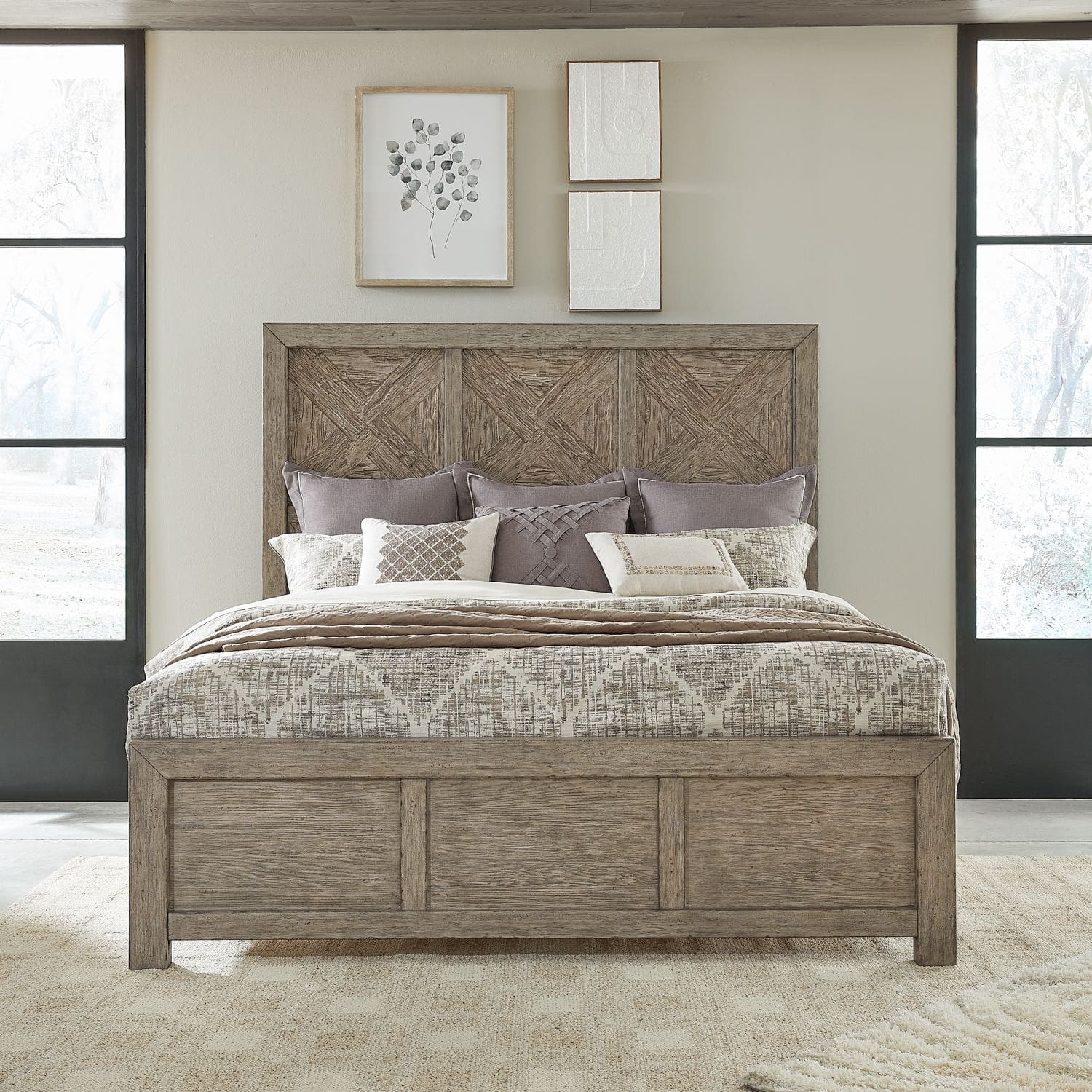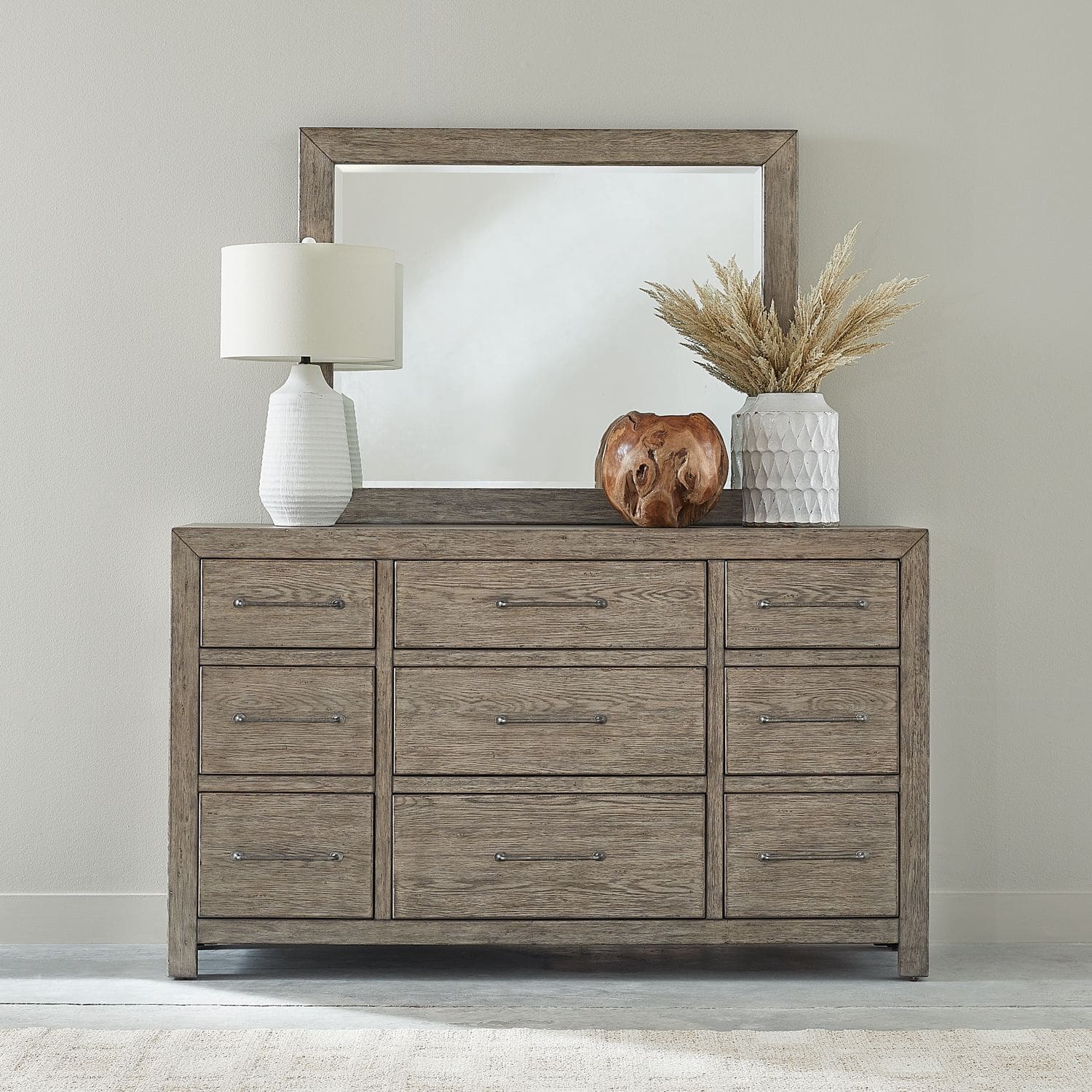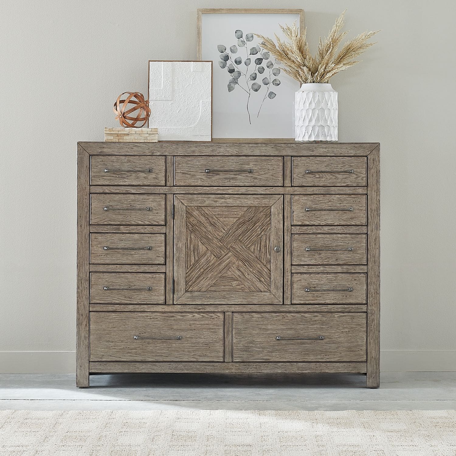 Experience the perfect fusion of style and substance with the Skyview Lodge queen panel bed, dresser, mirror, chest, and nightstand. Meticulously crafted using Rubberwood solids and White Oak veneers, this set features a Cobblestone finish. The headboard and footboard boast wide picture frame moldings that add depth and sophistication to any bedroom décor. What sets the headboard apart is its unique accent of X-reclaimed panels that feature wood overlays, creating a striking contrast against the sleek frame moldings. The footboard features exquisite center wood overlays, adding a touch of rustic charm and character. These overlays beautifully accentuate the natural grain and texture of the wood, creating a captivating focal point in any bedroom setting. The dresser, chest, and nightstand feature a block foot design that adds stability and visual appeal to their silhouette. The flat drawer fronts and softly rounded pilasters exude understated charm, while the graduated drawer sizes from top to bottom enhance its visual interest and practicality. Crafted for both style and convenience, the top drawers offer premium felt lining, providing a luxurious touch for delicate items. Meanwhile, the bottom drawers feature a cedar-lined panel, ensuring your garments remain fresh and protected. Experience seamless functionality with all drawers operating on soft-closing drawer guides, allowing for smooth and quiet operation. Accentuating its elegance are custom Antique Pewter bar pull hardware. The nightstand features a built-in charging station, adding a modern twist to this classic piece, with two electrical outlets, one USB, and one USB-C charging outlet, providing convenience and versatility for the modern lifestyle. The landscape mirror boasts a picture frame design, characterized by wide moldings that add depth and dimension to its appearance. The softly rounded edges lend a sense of gentleness, infusing the mirror with a subtle warmth that invites admiration. At the heart of it all, a 1-inch beveled edge adds a touch of sparkle, catching the light and casting a radiant glow across the room. Whether sitting by a roaring fire or roaring river, Skyview Lodge creates the perfect casual, relaxing environment.